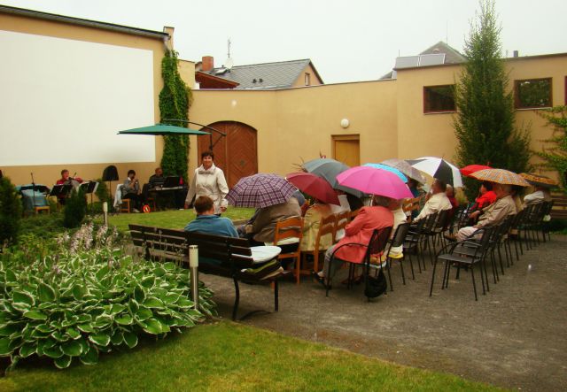 A ani déšť na dobré náladě nic nezměnil. K tónům hudebních nástrojů se přidalo i lehké bubnování kapek vody na deštníky. Následně, po rychlém přesunu do audiovizuálního sálu, následovala zábava až do večerních hodin. Přítomní si společně zatančili a zazpívali. „ Jako pokaždé se nám tu líbilo, odcházíme spokojení a těšíme se na srpnové opakování,“ uvádí jedna z posluchaček Marie (63let).